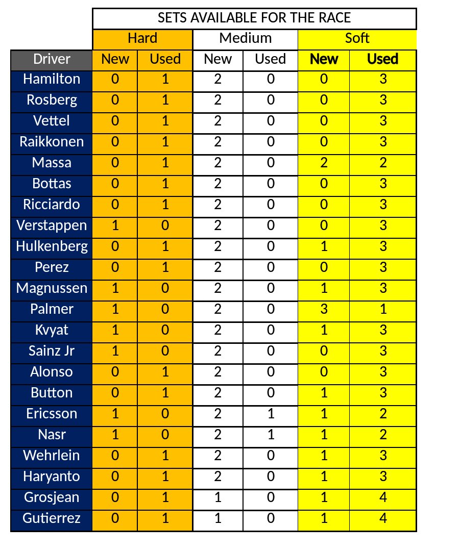 pour Gutierrez : 1 Hard usé (1 tour), 1 médium neuf, 1 soft neuf, 4 soft usés (env 3tours)