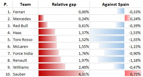 1er véritable échec de la saison pour Red Bull alors que jusque-là, elle améliorait davantage que Mercedes ses temps de la saison passée. Renault reprend sa place de leader.