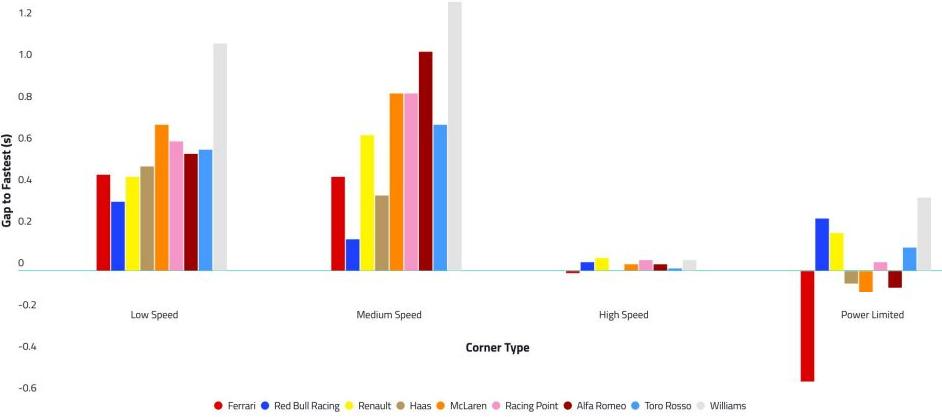 On remarque que Haas avec son rake fait jeu presque égal avec la Renault dans les courbes lentes, dans les lignes droites la Haas n’apparaît pas dans le tableau donc pas de retard par rapport à Renault. Dans les courbes moyennes c'est la catastrophe pour le RS19 et Haas s'en sort mieux que Ferrari et se situe juste après Red Bull.