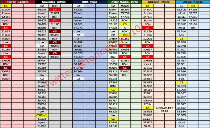 C'est une impression très personnelle. La simulation "complète" de Leclerc, par rapport à d'autres plus courtes de sa part, me fait penser à une voiture avec plus de carburant que nécessaire, voire à une petite baisse de puissance à partir du 1er arrêt. En qualif, je ne vois pas Leclerc hors du top 7 vu ce qu'ils ont réussi dans ce domaine en 2020.